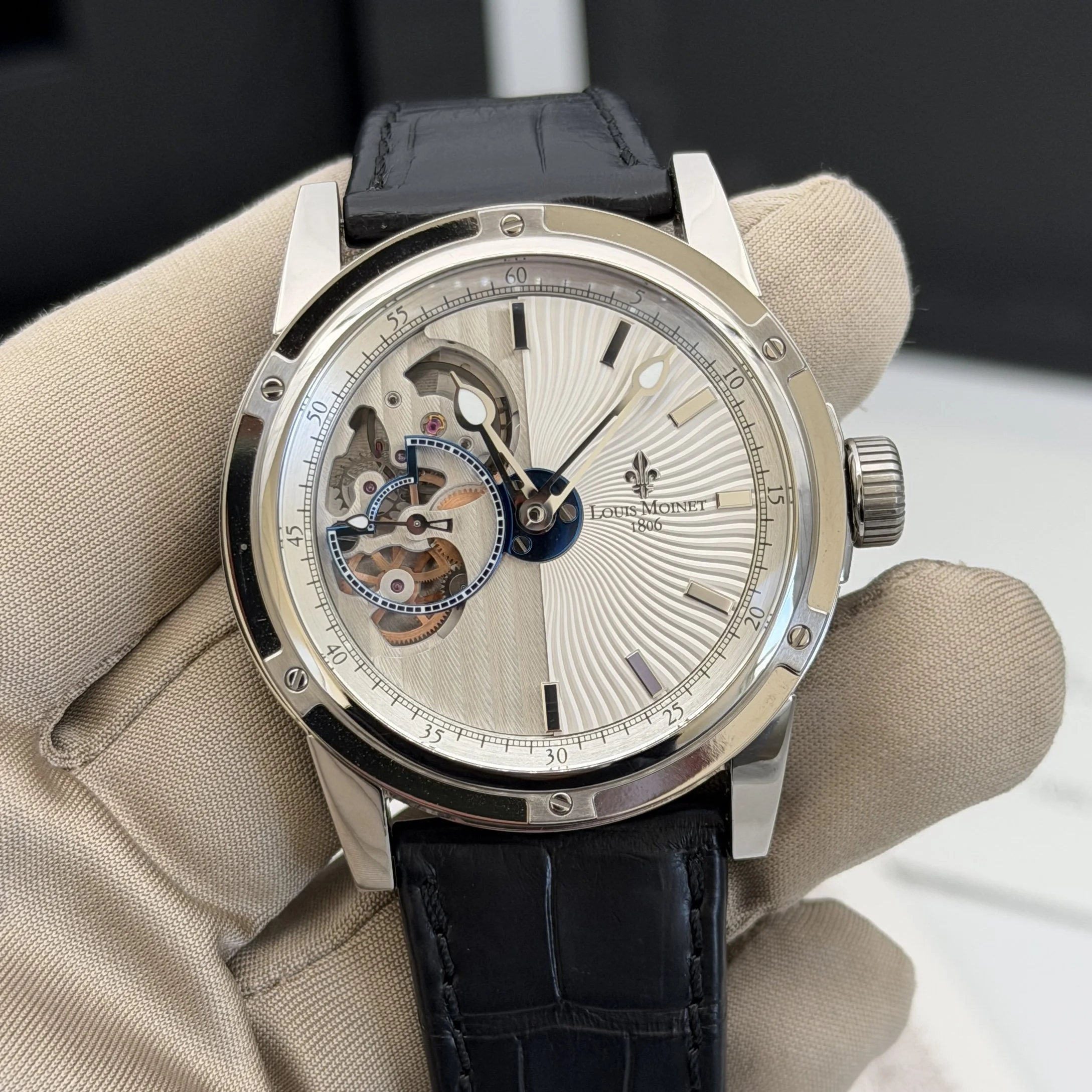 This piece showcases Louis Moinet’s signature approach to watchmaking - bold, technical, and unapologetically intricate. The openworked dial reveals a mesmerizing mechanical architecture, that feels as much like a kinetic sculpture as it does a precision instrument. Every component is thoughtfully executed, blending avant-garde design with exceptional finishing.